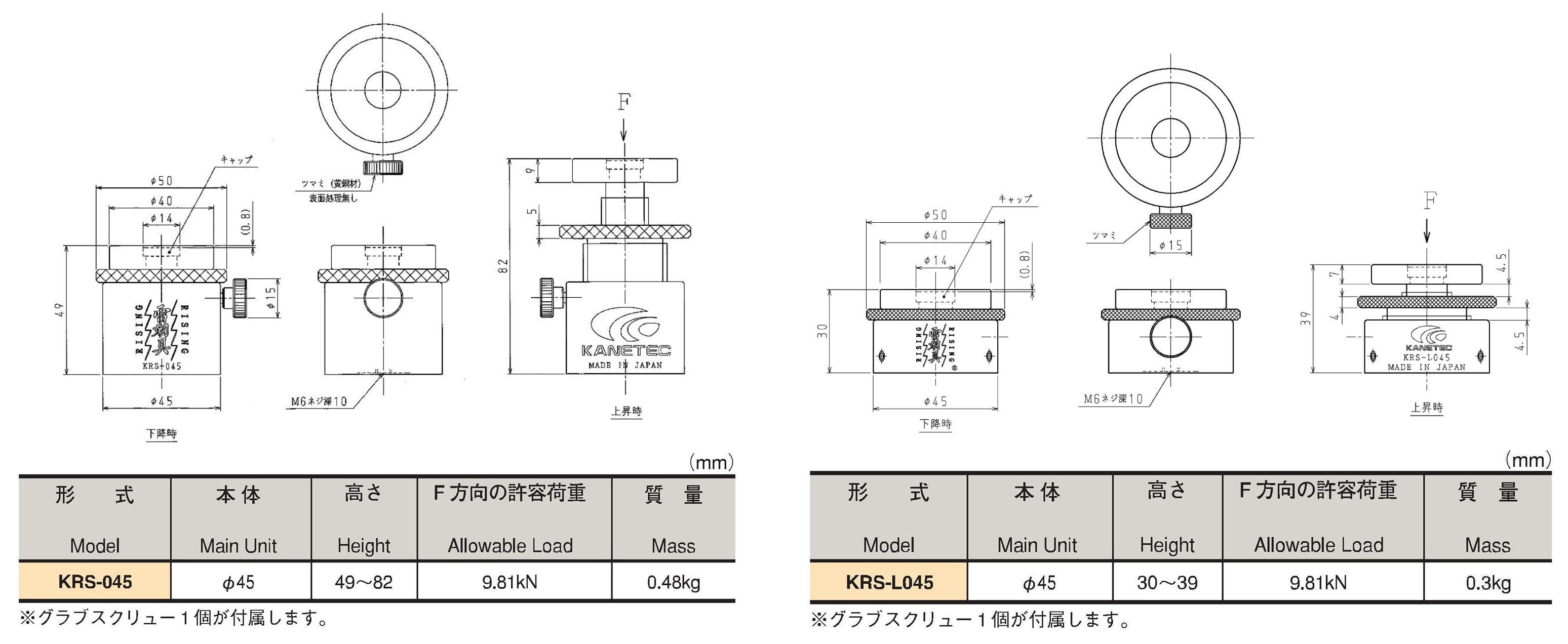 ![]() KRS-045 上昇時 49~82mmの中空範囲に対応出来ます。 角ねじを採用し、スピーディー且つスムーズな調整が可能です。 ![]() 30~39mmの狭い中空範囲で調整出来ます。 細目ネジを採用し、KRS-045と比較しより細かな伸縮調整が 可能です。 |
