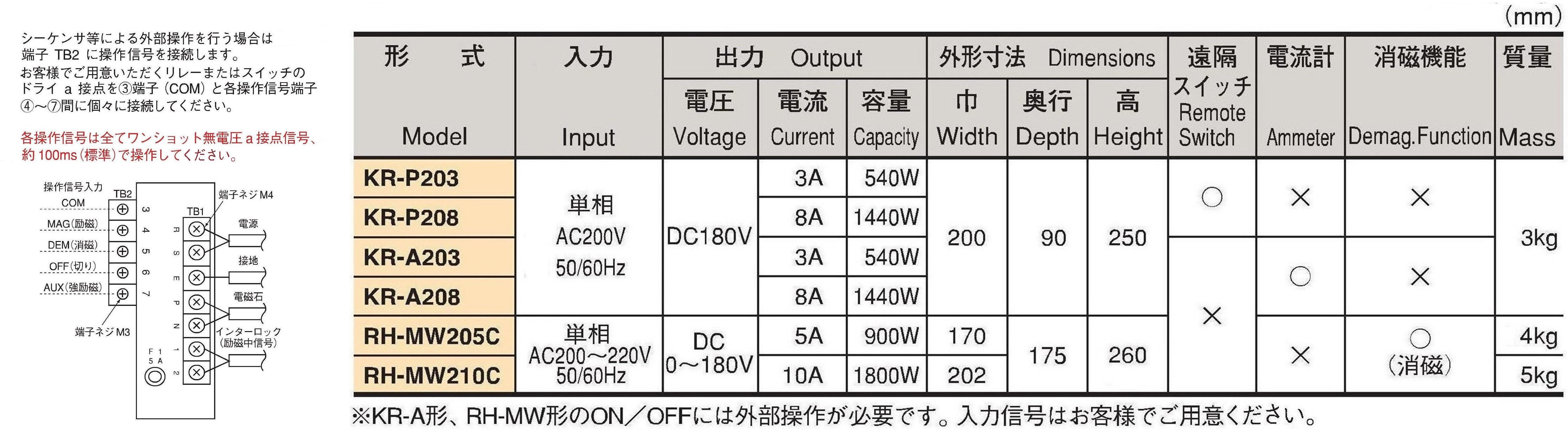 ≪消磁回路付整流器≫ 吸着面の平坦なワークやFCなどの磁気が残留しやすい材質を吊上げた場合、供給電源を切っただけでは、 【用途】 交流電源からの入力を直流に整流し、電磁リフマ®に出力します。 電磁リフマ®をご使用の場合は、必ず整流器が必要です。KR-P、A、RH-MW形の3種類あります。 【特長】 0~180Vまで電圧可変が可能です。 外部制御入力端子付き。 過電圧保護機能付き。 |