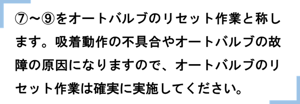 吸着力が不足しているようでしたら、オートバルブのリセット作業(後述⑦~⑨)後、再度固定作業をしてください。